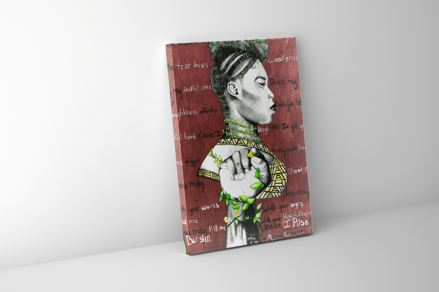 "Rise" is a print that showcases poetry from Maya Angelou and the strength of the black voice. My original character Georgia is front and center showing her appreciation for art and creativity.