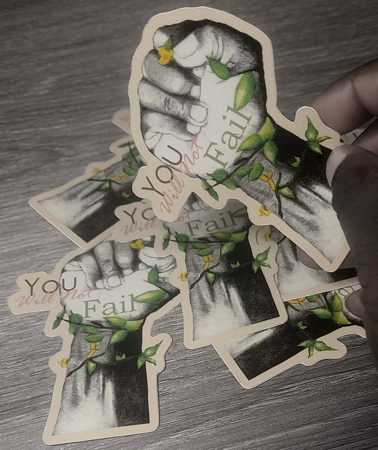 The Rise sticker comes from the Rise print associated with the character Georgia. This is a reminder that you will not fail in the journey that you're in. You may stumble and fall, but, get back up and keep pushing.